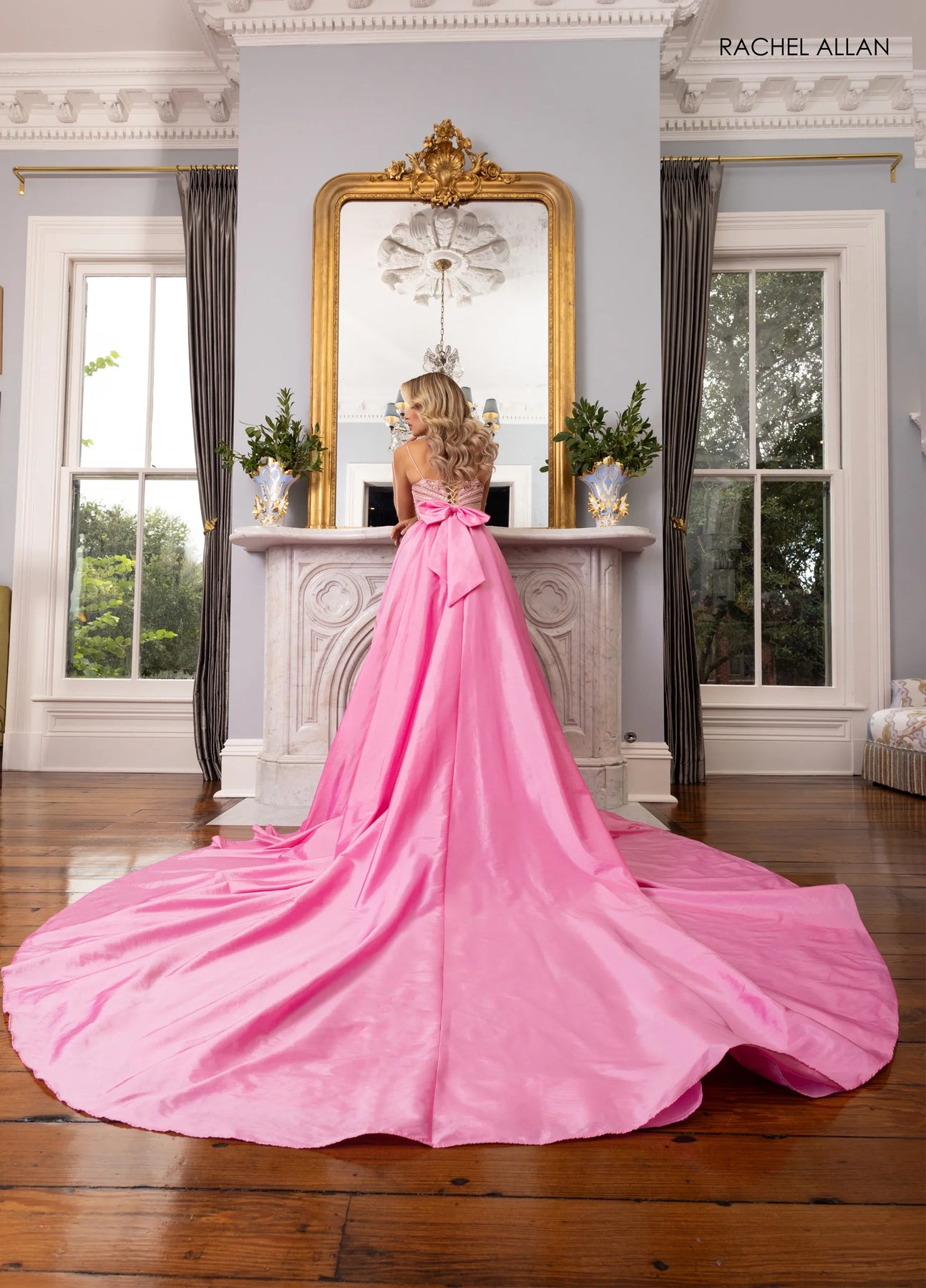 Transform your look with the Rachel Allan OVL1000 Dress, featuring a stunning detachable overlay that brings instant drama and movement to any occasion. The removable design lets you switch between sleek and sensational styles, while the signature statement bow adds a cheeky, glamorous touch. Perfect for prom, pageants, or red-carpet moments, this dress gives you the flexibility to customize your vibe—go bold and voluminous or keep it classic. Elegance meets playfulness in one show-stopping piece.