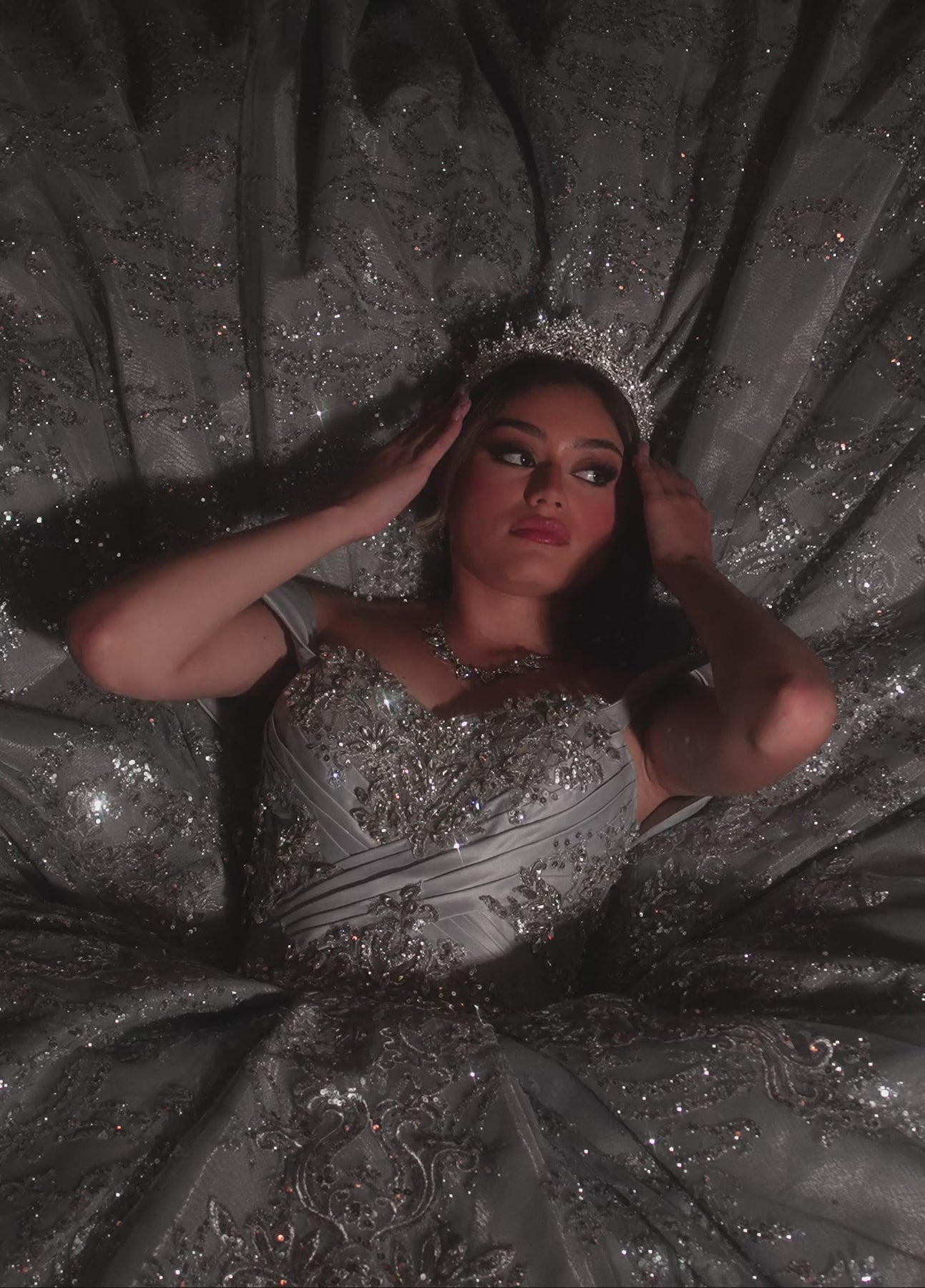 Step into fairy tale magic with the Rachel Allan RQ2194 Dress. This princesa gown dazzles in deep glitter tulle, sparkling with intricate embroidery that captivates from every angle. Its satin heart-shaped neckline and off-the-shoulder sleeves bring a royal flair, while the voluminous skirt twirls in luxurious layers, decorated with enchanting patterns. Perfect for making a grand entrance full of charm and elegance.