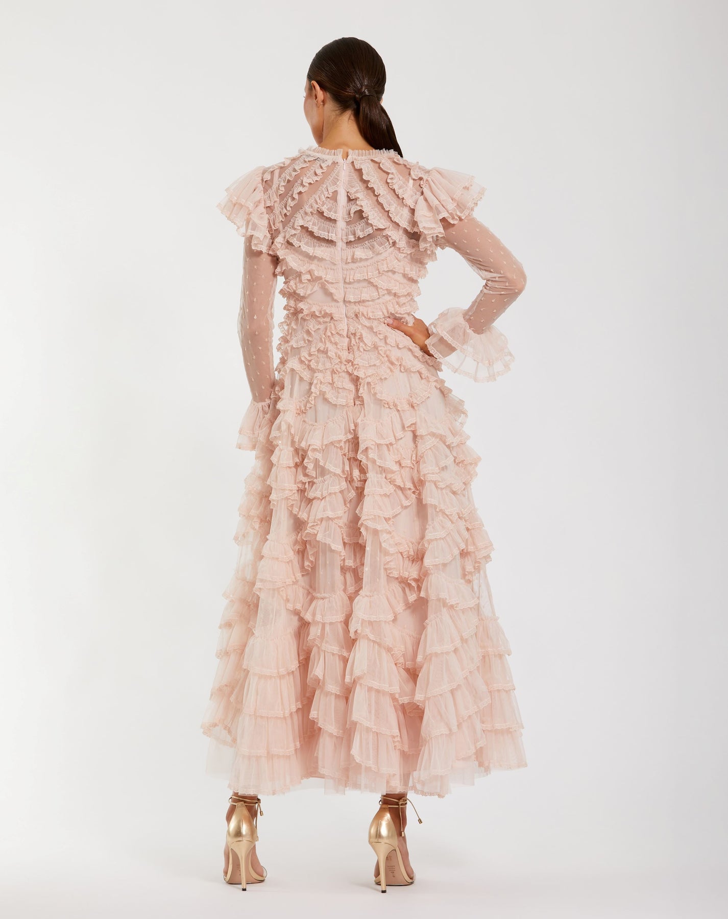 Pink Dot Net Ruffle Trim High Neck Ankle Dress