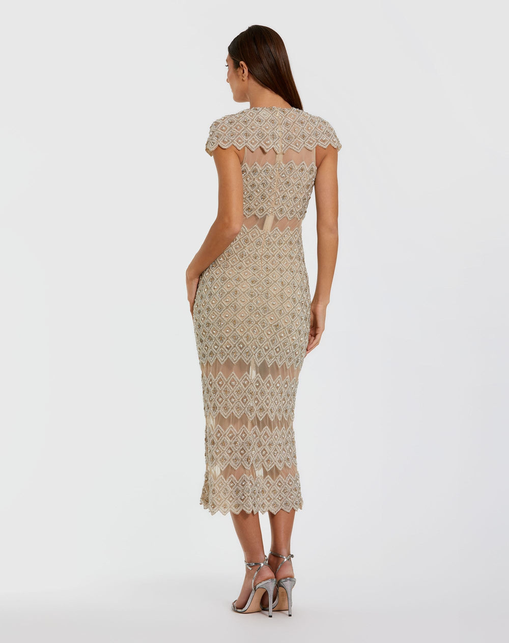 Step into the spotlight in this dazzling embellished midi dress. With its beaded geometric design, eye-catching illusion panels, and scalloped hem, it delivers unforgettable glamour for any special occasion.