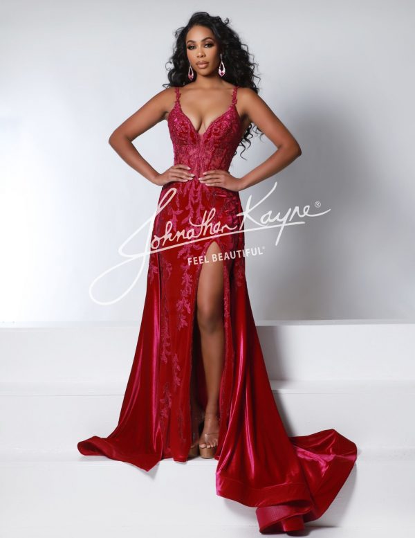 Slip into the Johnathan Kayne 2924 Dress and let the stretch velvet hug your curves just right. With a daring slit that adds a flirty twist and delicate lace adorned with sparkling beads, this gown turns heads and sparks smiles wherever you go. Perfect for making a bold, glamorous statement with a playful edge.
