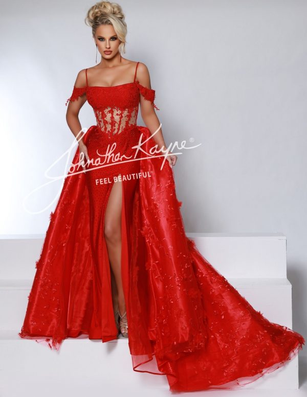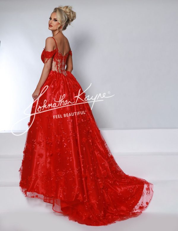Step into a storybook dream with the Johnathan Kayne 2965 Dress. Its exposed boning bodice and dramatic overskirt create a striking silhouette, while delicate 3D flowers cascade gracefully down the skirt. Playful spaghetti straps add a flirty touch, and sparkling rhinestones catch the light with every twirl. Perfect for making magical memories!
