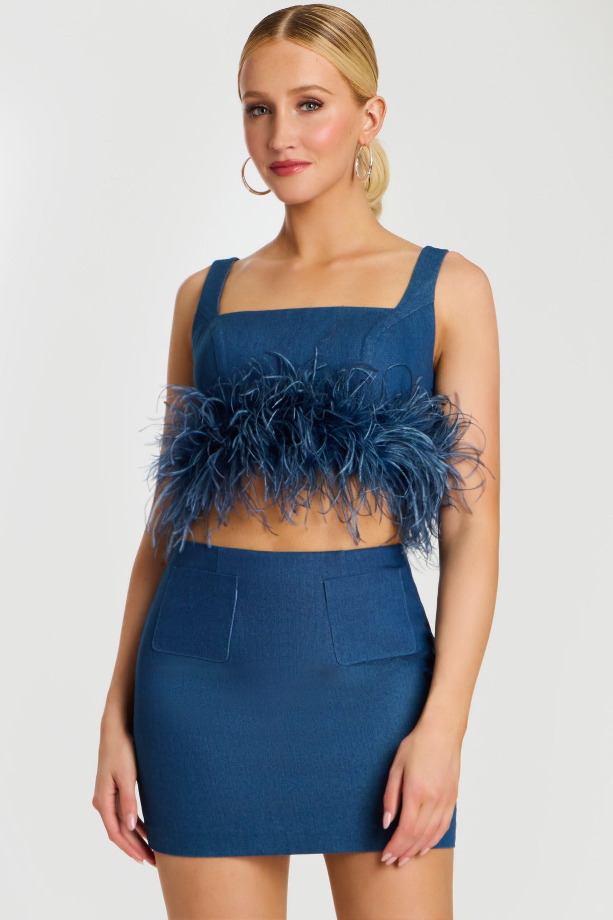This Jovani 45974 ensemble features a denim feather crop top paired with a matching mini skirt, creating a bold two-piece set that blends texture and style. The feather detailing adds a unique tactile element, while the denim base ensures durability and a contemporary edge. Perfect for making a statement at events, this set balances playful sophistication with modern fashion sensibilities.