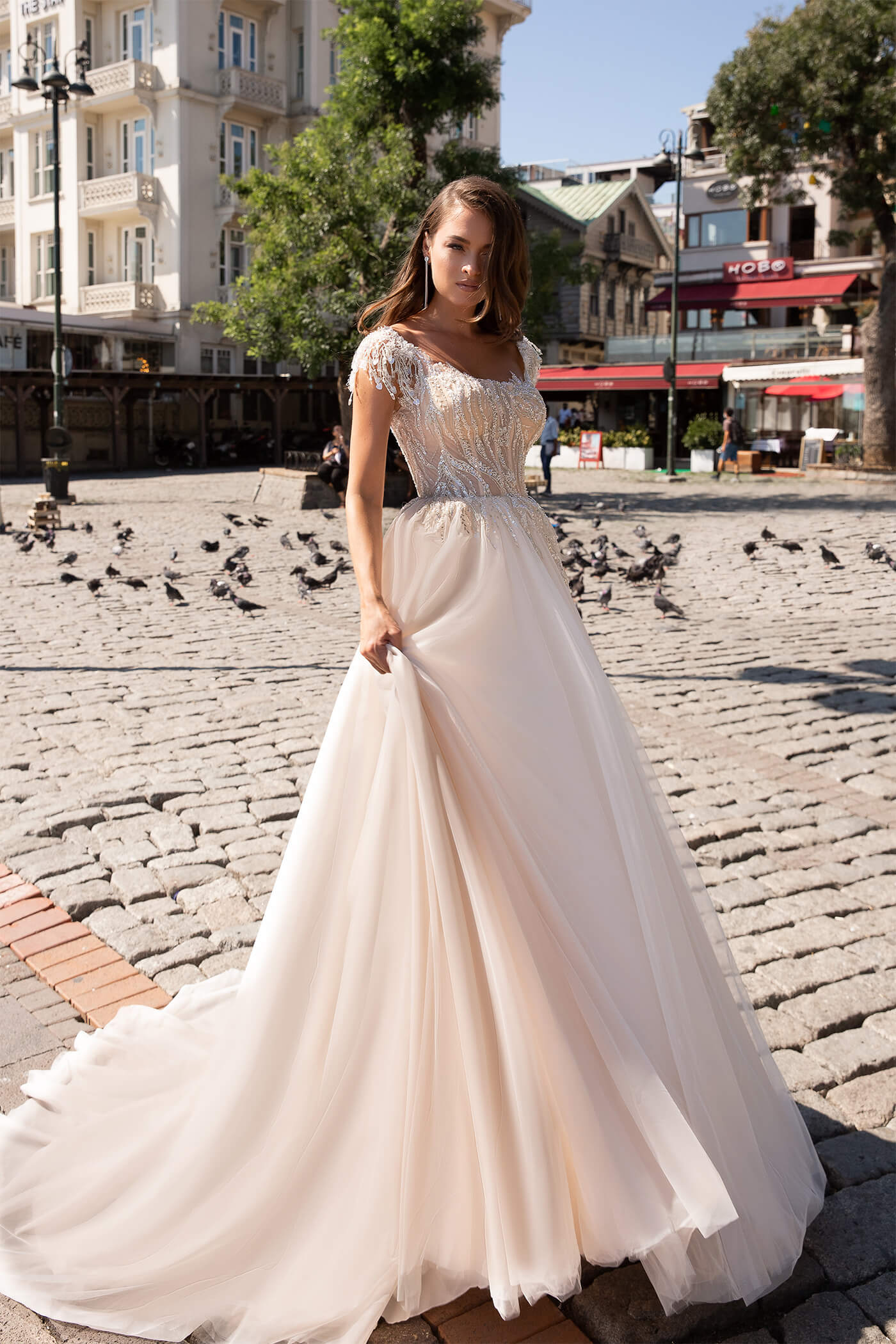 The Maria Anette 5220 Dress redefines bridal boldness with its striking square neckline and short sleeves. This long-length gown features intricate beading that catches the light with every movement. Its open back adds a provocative edge, perfect for a bride who wants to stand out with confidence and style on her wedding day.