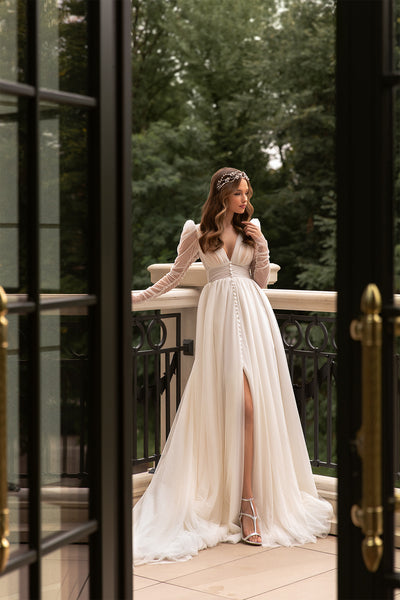 The Maria Anette 5324 Dress is a bold statement of elegance with its plunging V neckline and daring V backline. Long sheer sleeves add a touch of mystery, while the high slit enhances its seductive silhouette. This long-length gown is designed for the bride who wants to captivate with fearless sophistication.