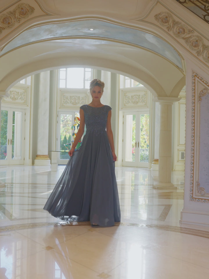 The MARSONI BY COLORS M238 Dress is an elegant A-line chiffon piece featuring an intricately embroidered bodice adorned with stone embellishments. Its boat neckline and delicate cap sleeves create a refined silhouette, making it an ideal choice for sophisticated events. This dress combines craftsmanship and style to ensure you stand out with effortless grace.