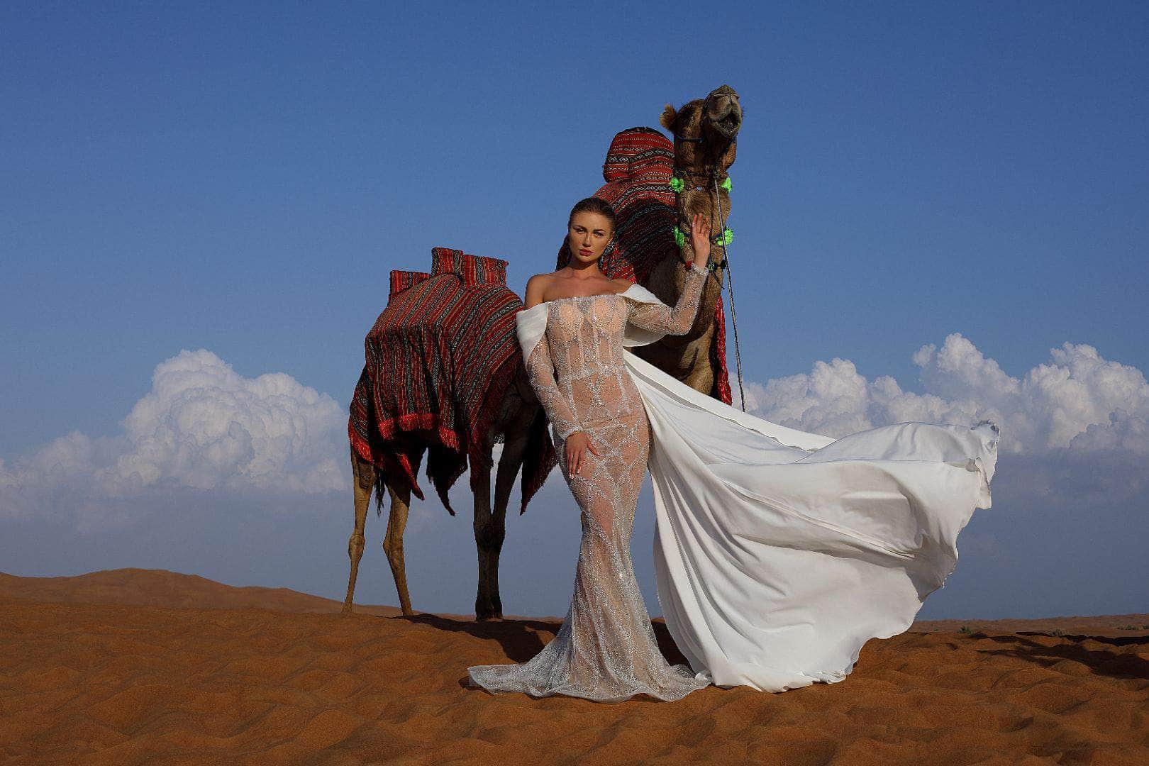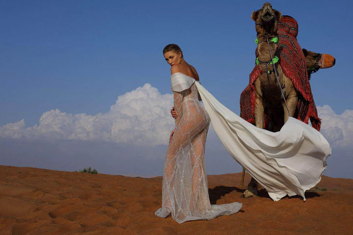 Make a statement in MNM Couture K4038, a dramatic mermaid gown with sheer long sleeves and a flowing cape. Intricately beaded details add depth and luxury, while its off-shoulder silhouette highlights timeless elegance.