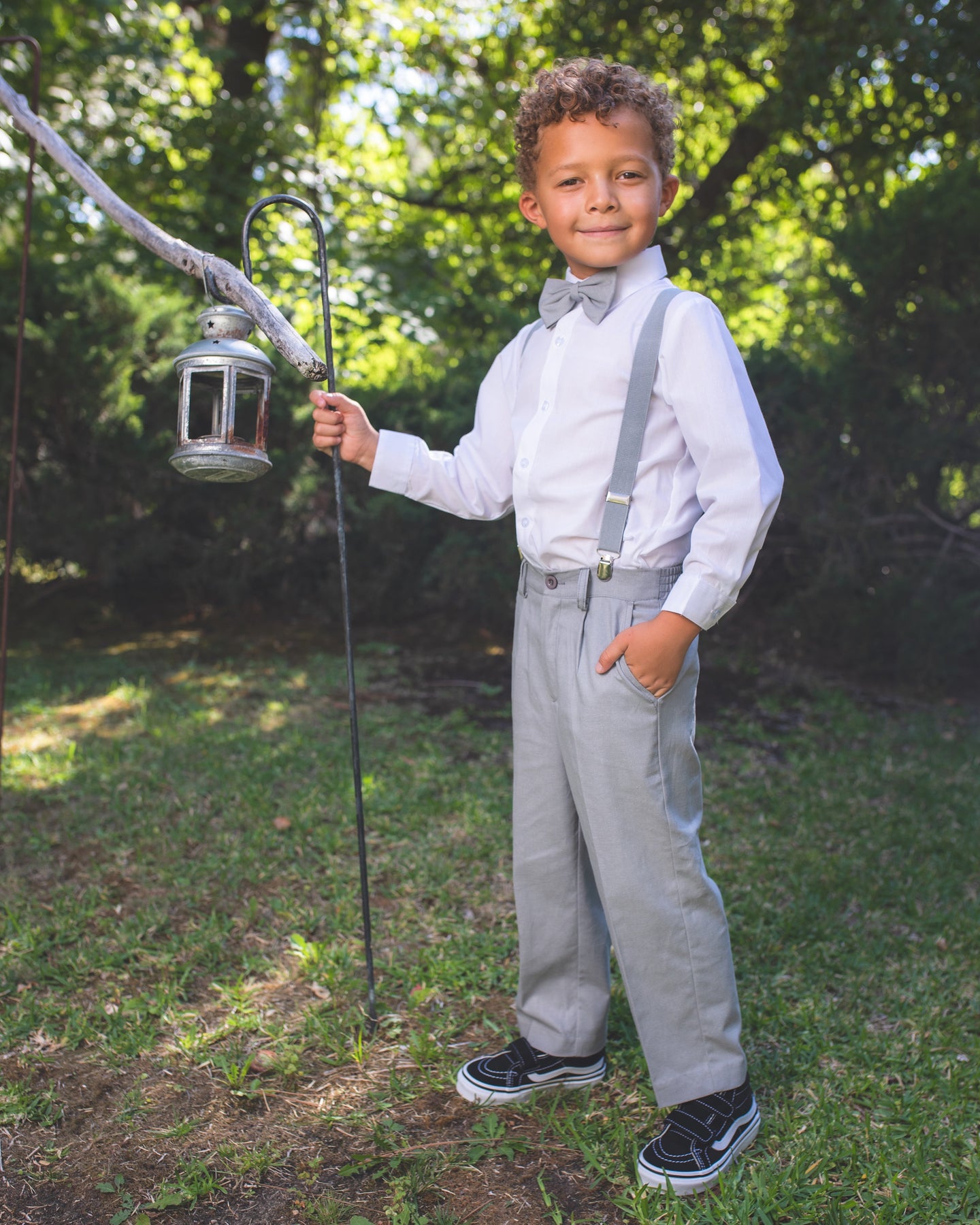 Introduce your little one to timeless elegance with the Peanut Butter Collection Barn Set Safari Heather. Crafted from 100% linen, this complete formal ensemble features a slim-fit design that adapts beautifully to growing bodies while maintaining comfort and durability. Perfect for ring bearers, weddings, and special occasions, this versatile set combines rustic charm with refined style. Each set includes tailored pants, a coordinating shirt, suspenders, and a bow tie everything needed for a polished, put-together look. Whether you're planning a destination wedding or celebrating under the stars at a barn venue, this thoughtfully designed collection ensures your child looks and feels confident throughout the celebration.