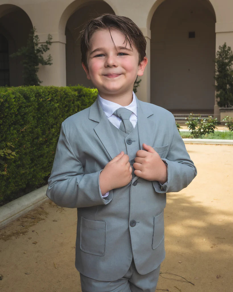 Introduce your little one to timeless elegance with the Peanut Butter Collection Joey Safari Heather suit. Crafted from 100% linen, this slim-fit ensemble delivers comfort and durability for any formal occasion from weddings and ring bearer duties to destination celebrations and rustic affairs. The complete four-piece set includes a jacket, pants, vest, shirt, and tie, ensuring your child looks polished and put-together. Thoughtfully designed to flatter all body types, this sophisticated suit makes formal dressing effortless and enjoyable for kids.
