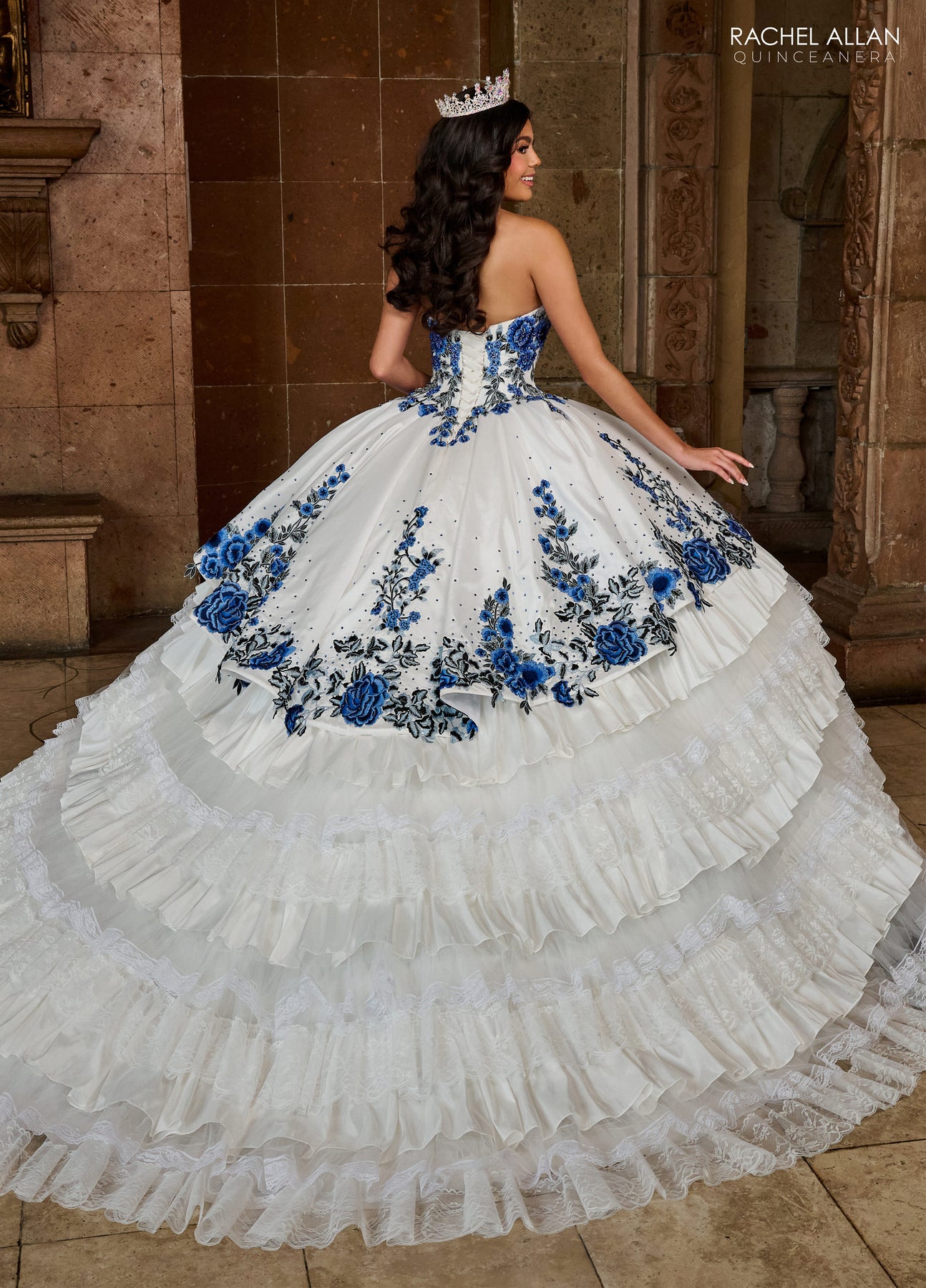 The Rachel Allan RQ5002 dress is a dreamy taffeta ballgown designed to make every quinceanera girl feel like royalty. Bursting with pretty lace, sparkling appliques, and delicate beading, it’s a sparkling masterpiece. The detachable tulle sleeves add a fun, magical flair—perfect for twirling and making unforgettable memories!